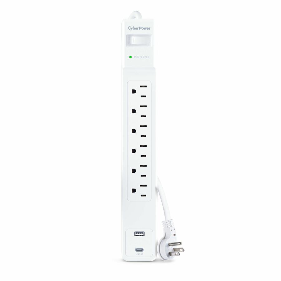 The CyberPower CSP604UCW Surge Protector provides essential surge protection for home and office electronics, including computers and other sensitive devices. Engineered to defend against power surges and energy spikes resulting from storms and electrical fluctuations, it offers 1500 joules of protection across six outlets. A durable 4-foot power cord ensures flexible placement, while the inclusion of one USB-A port and one USB-C port enables convenient charging of smartphones, tablets, and other mobile devices without occupying the primary outlets.