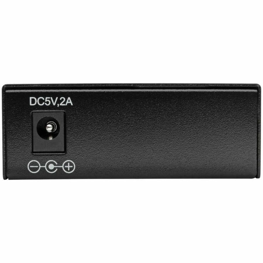 The N785-INT-SC includes an external power supply with international plug adapters for North America (NEMA 5-15P), the United Kingdom (BS 1363), Europe (CEE 7/16 Schuko) and Australia (AS/NZS 3112). The plug-and-play fiber-to-copper media converter requires no software or drivers and is easy to set up.