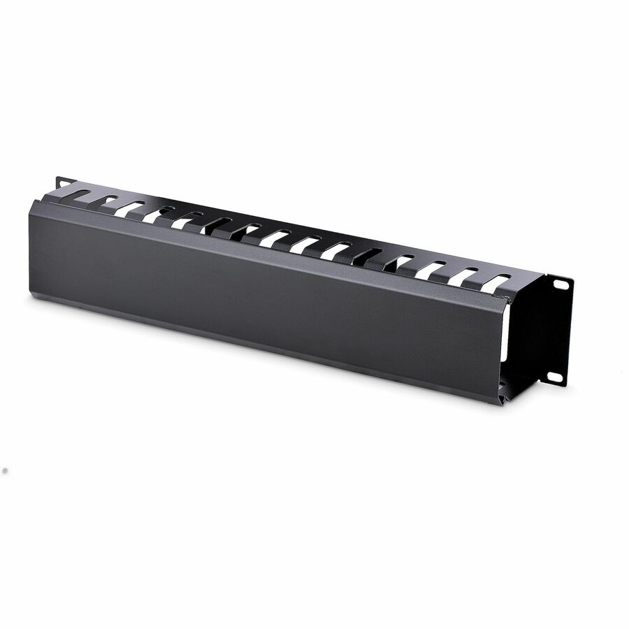 The CMDUCT2U 2U Finger Duct Cable Management Panel mounts to a standard 19" 2 or 4-post rack to help you organize horizontal cabling, through a covered cable duct. The 2U cable organizer features a removable top cover that makes it easy to add or remove bundled cables quickly. The duct also offers a series of fingers on either side, as well as pass-through holes at the back to help you route your cables where you need them, and reduce cable strain in the process. Made of high-quality steel and plastic, the cable manager is a durable solution for your server room or wiring closet. For easy installation, this horizontal cable organizer comes complete with M6 screws. Backed by a StarTech.com 2-year warranty.